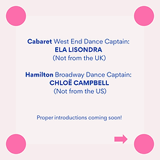 NOTE!! THE LIVE EVENT HAS ALREADY TAKEN PLACE. YOU CAN STILL REGISTER TO WATCH THE RECORDING (STREAM). Once you book, I will receive the streaming link. Post event message: Ela and Chloe shared an incredible journey — not just the highlights, but the real moments: but the moments where they genuinely questioned if they could keep going, and the parts of the job that still feel hard even now, at the top of their careers. They showed up with so much honesty and vulnerability, and I truly hope their stories reach as many students and artists as possible. ✨ If you couldn’t make it live, this is your chance to catch everything they shared — unfiltered, generous, and deeply inspiring. *************************************************************************** Original Event Info: This is your once-in-a-lifetime chance to hear the actual, unfiltered journeys of two international Dance Captains currently working on two of the biggest shows in the world — one West End, one Broadway. ELA LISONDRA — Dance Captain, Cabaret (West End) · from the Philippines CHLOË CAMPBELL — Dance Captain, Hamilton (Broadway) · from the UK Both trained far from the cities they now lead. This is NOT a workshop. This is NOT a masterclass you can take at any school. This is the stuff they never teach in college, conservatoire, or any open class: - The real story of how they actually got there (the wins, the detours, the luck, the grind) - Was being Dance Captain the dream — or did it just happen? - Dance Captain responsibilities and leadership expectations inside major productions - Would they do anything differently if they could start again? - How do you survive eight shows a week while being a mother and a human? - What does a normal day look like when you’ve “made it”? - Mindset and sustainability — how to stay resilient in long-running shows - What’s next after you’ve reached the absolute top? - 30- minutes of live Q&A — small group, everyone gets heard Intimate group (capped around 35–40) · 90 minutes · Real Chat & Q&A